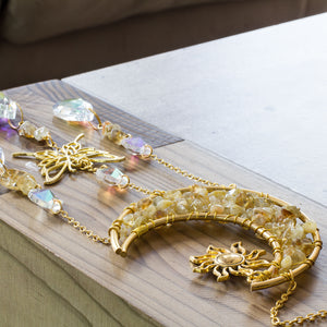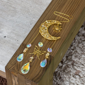 Natural Yellow Quartz Chip & Metal Moon Hanging Suncatcher