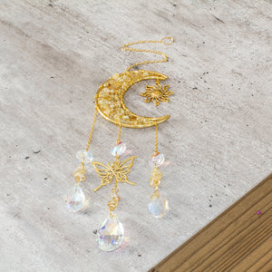 Transform your living space with the captivating beauty of this exquisite crystal chip suncatcher. Watch in wonder as the glass teardrop reflects a stunning array of rainbow colors, spreading their vibrant beauty throughout your home. The suncatcher is adorned with a celestial theme, featuring the sun, moon, and an elegant butterfly, adding a touch of warmth and comfort to your living space. Elevate your home decor with this enchanting and mesmerizing suncatcher.
