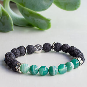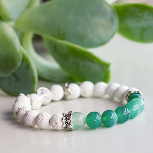You can balance this Chakra with green agate gemstone crystals and its unique essential oil blend which you place on the Lava beads.