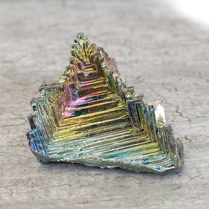 Bismuth is believed to boost energy, vitality, and help achieve goals, especially when working with a team. It is said to aid in transformation by connecting the physical realm with the astral and spiritual planes. Additionally, it is thought to improve visualization during shamanic journeys. Lastly, it is believed to ease feelings of being overwhelmed, isolated, and lonely. Bismuth is often confused with tin and lead, but it is its own element, number 83 on the periodic table. In its natural form, it is a shiny white brittle metal and is quite rare. It is more commonly found as a rainbow-colored crystal, a by-product of mining and refining lead, copper, tin, silver, and gold.
